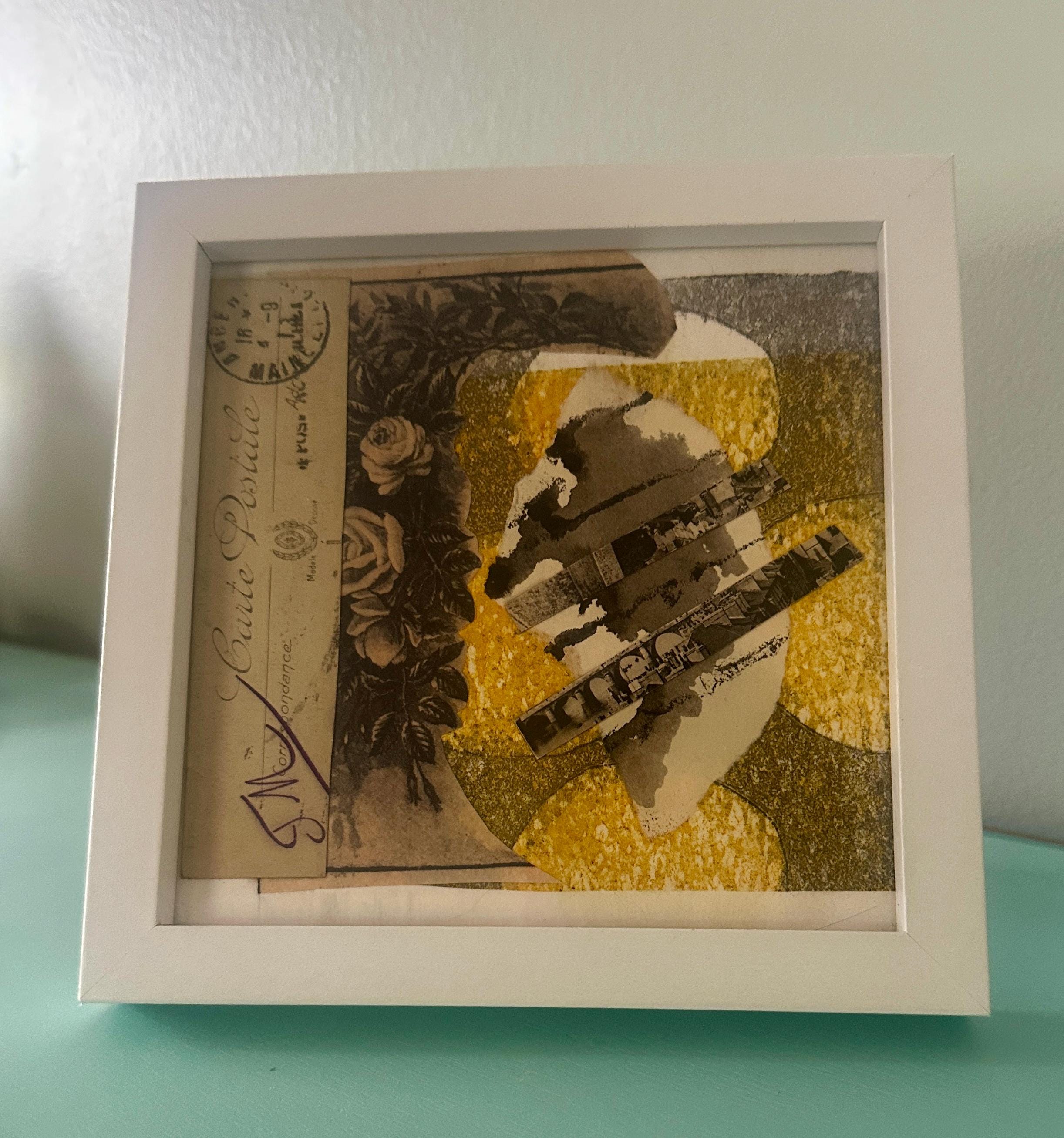 Original framed mixed media collage on watercolor paper featuring vintage and hand painted and printed papers. Framed and ready to gift or decorate your home. Each collage is a one of its kind original.