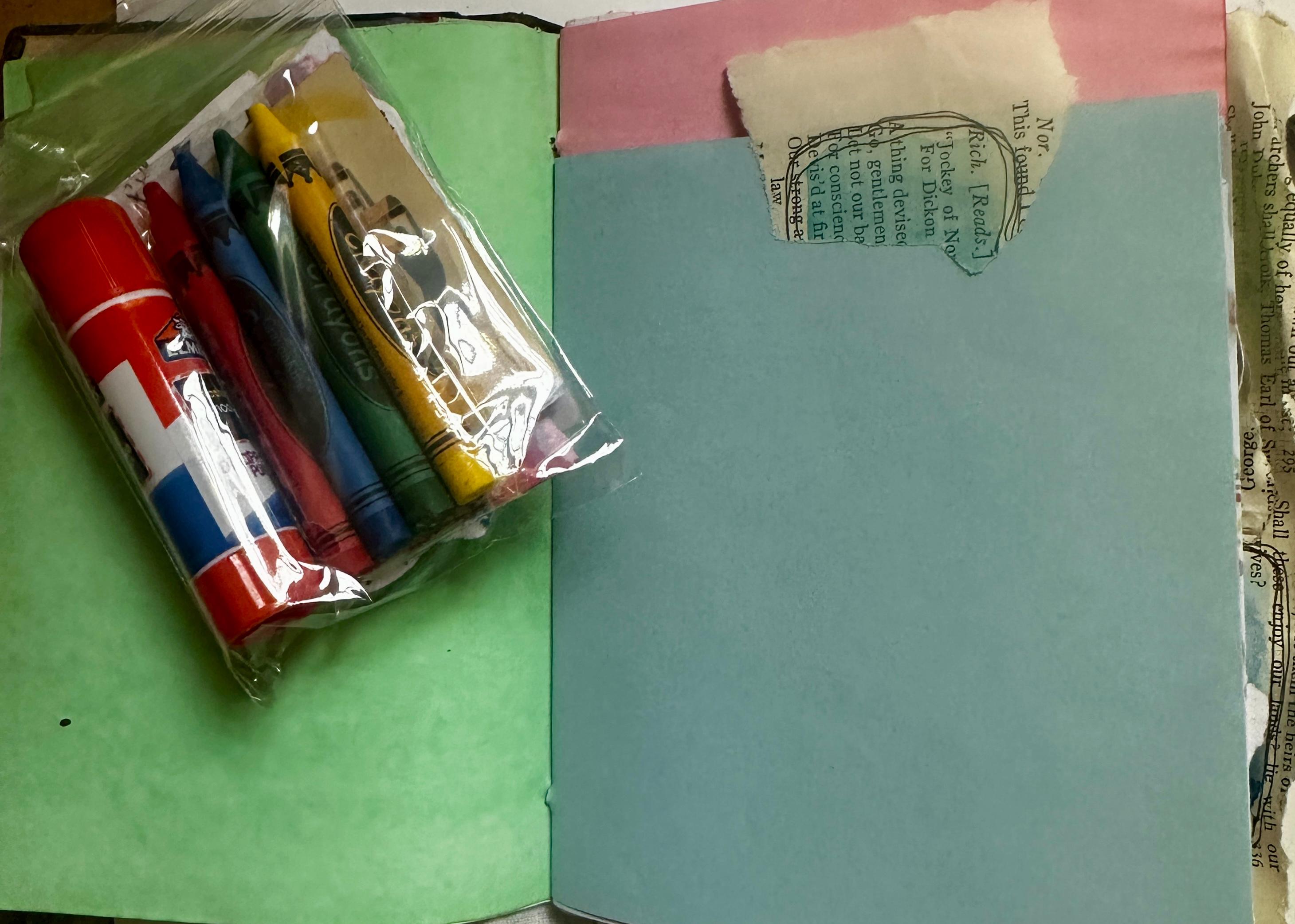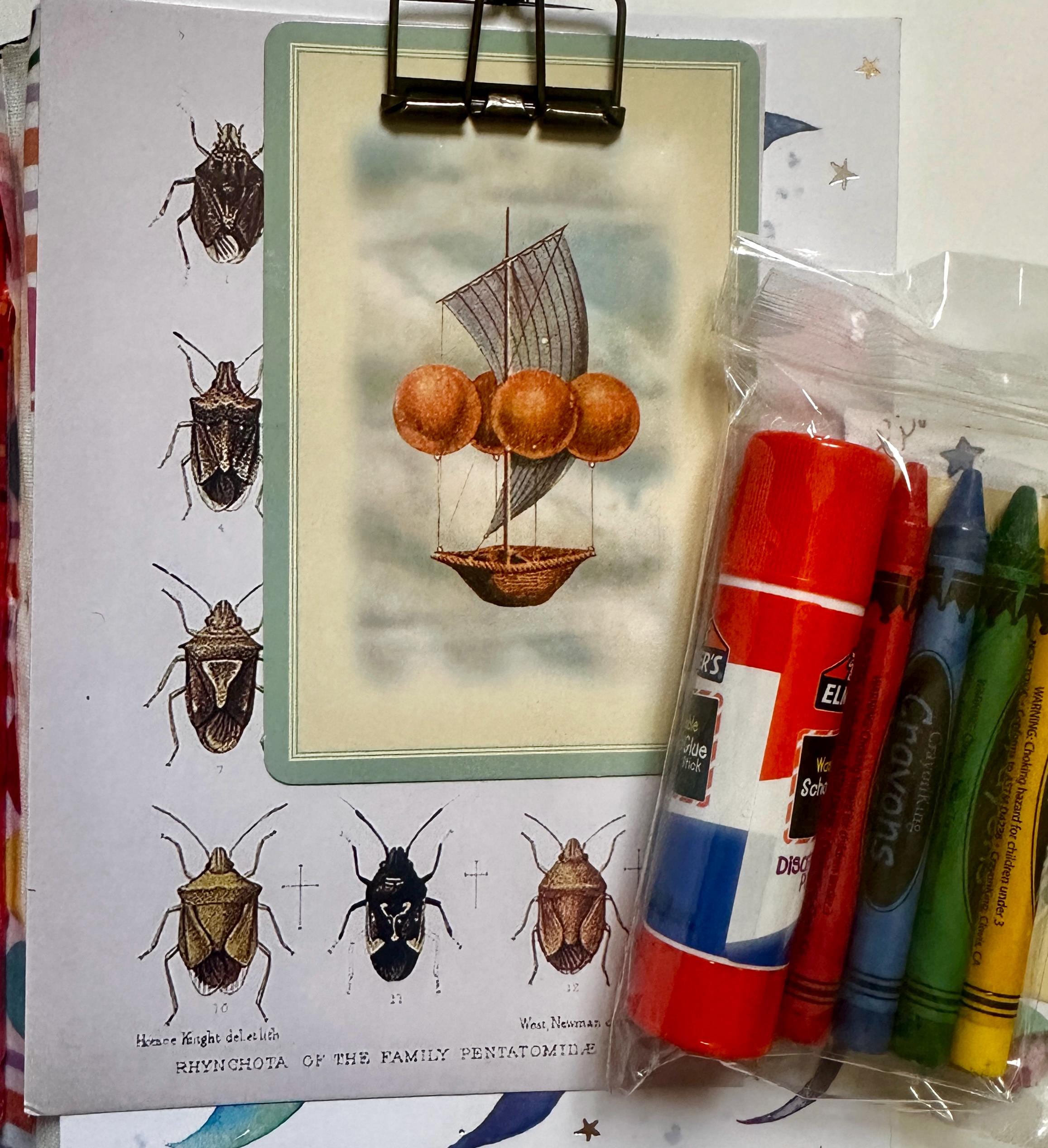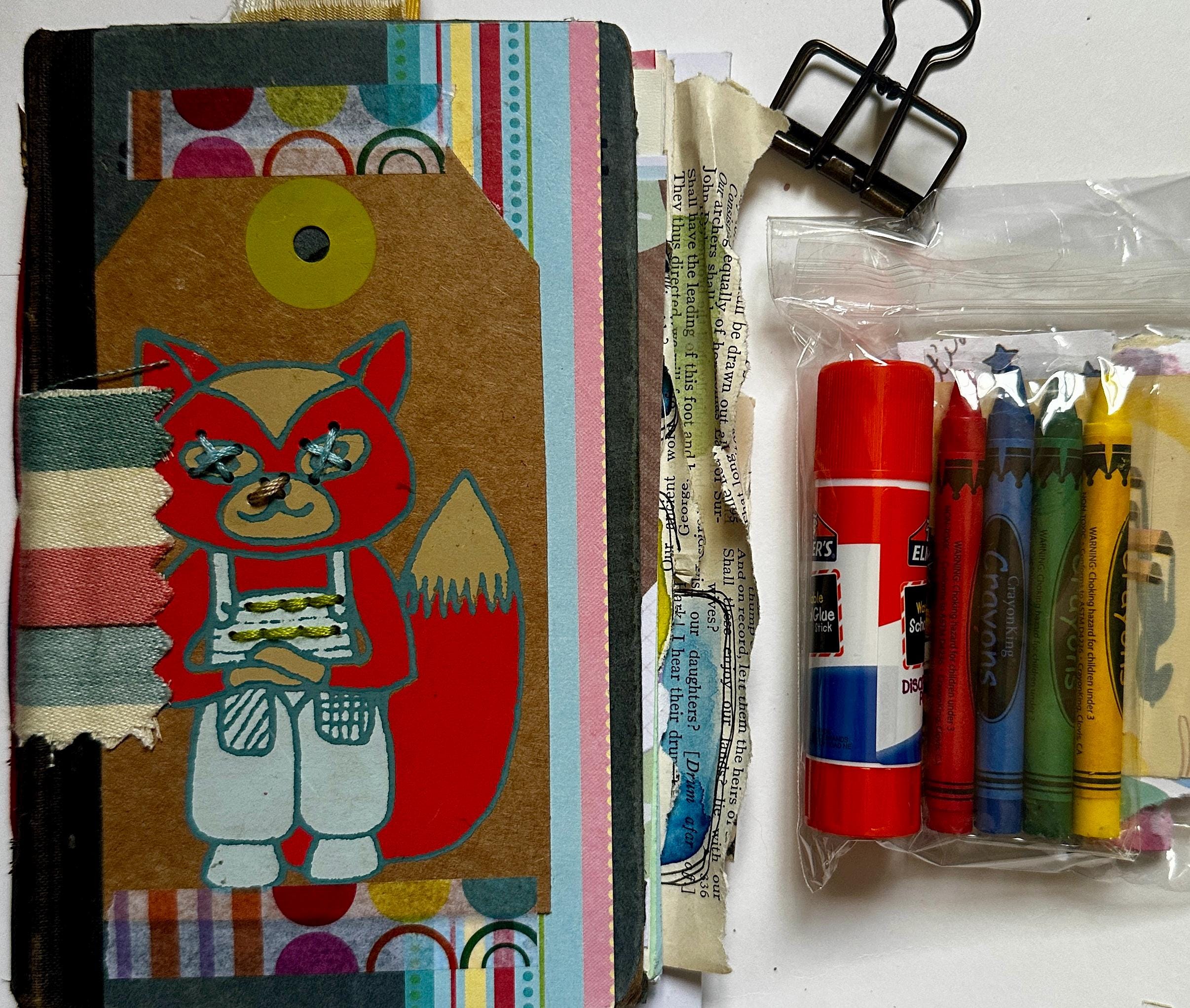 Vintage book turned handmade journal inspired by pure whimsy. Perfect for kids or for the kids at heart. Full of color and so many delightful papers complete with an art starter pack of glue stick, crayons, and stickers. There are envelopes and tuck spots for journaling and art. No two are alike. Vintage and modern ephemera combine to give you the perfect place to create and dream.