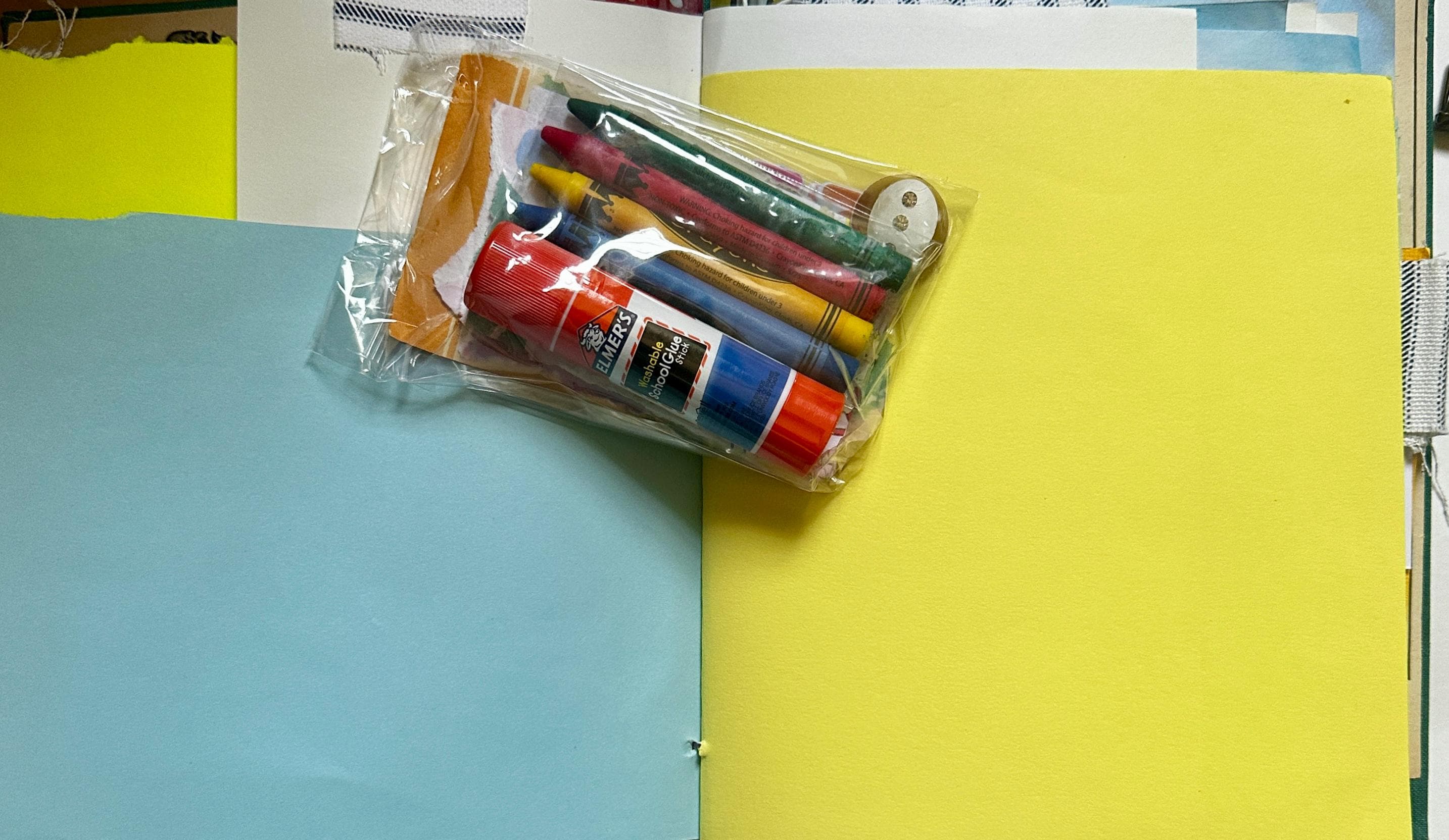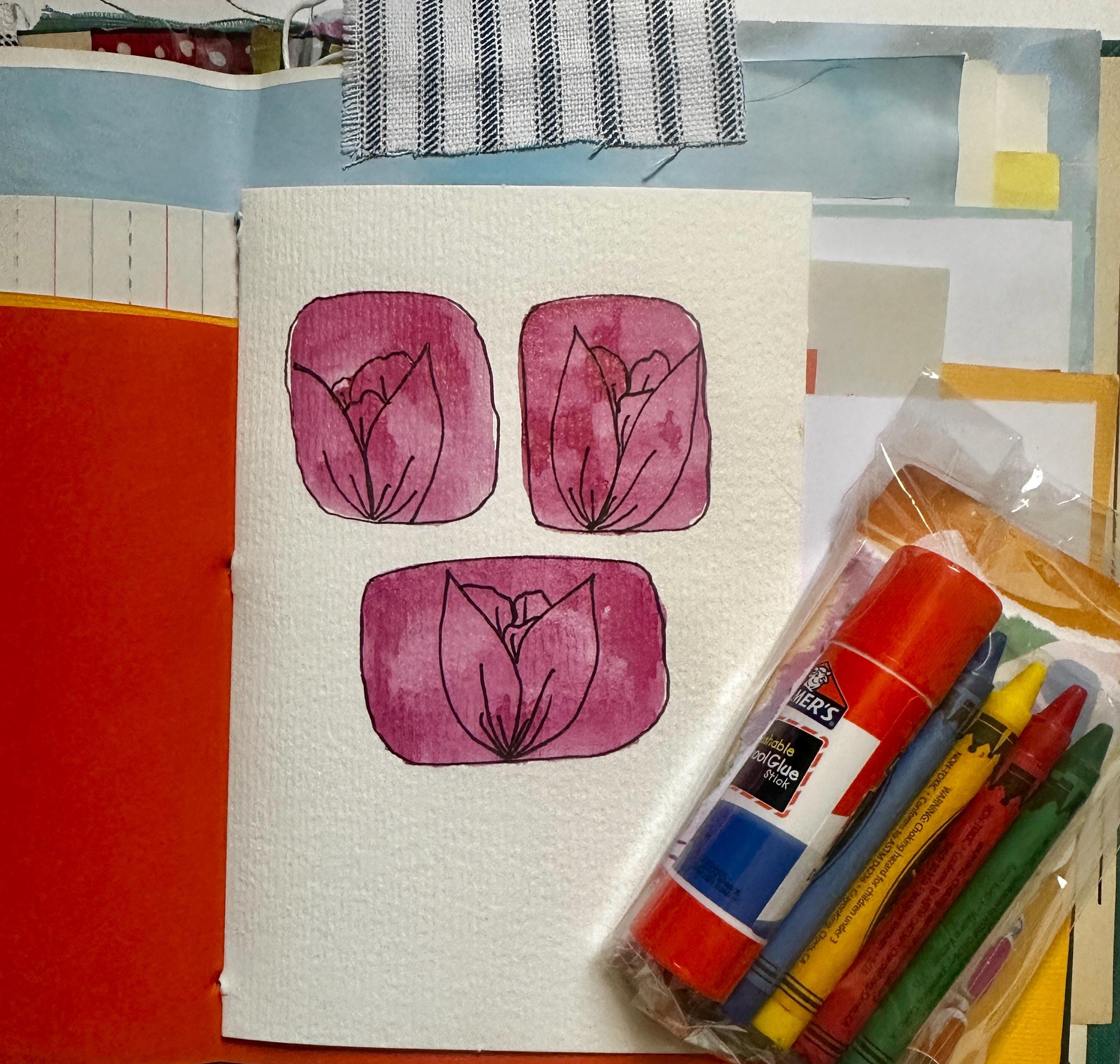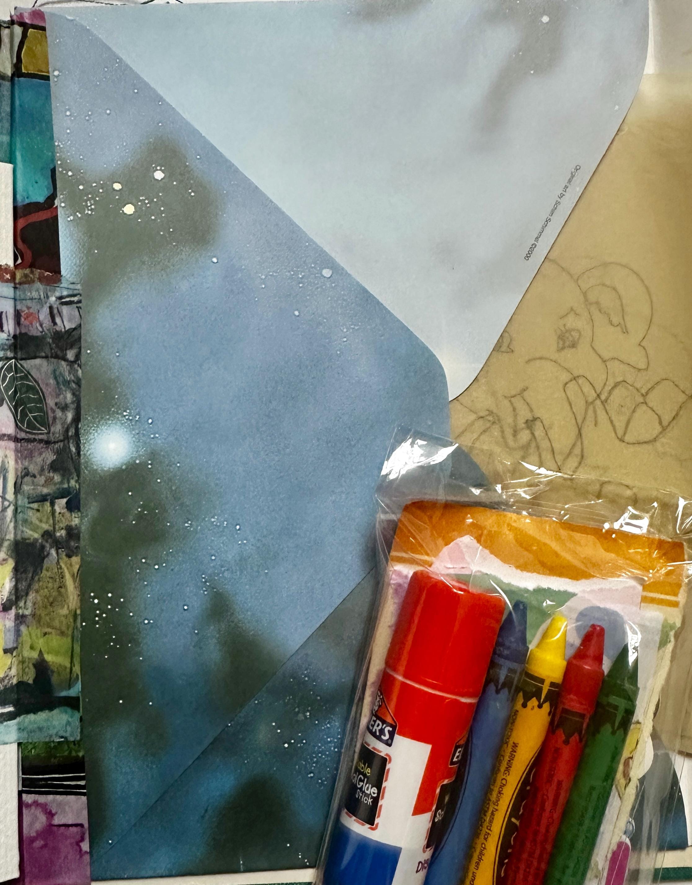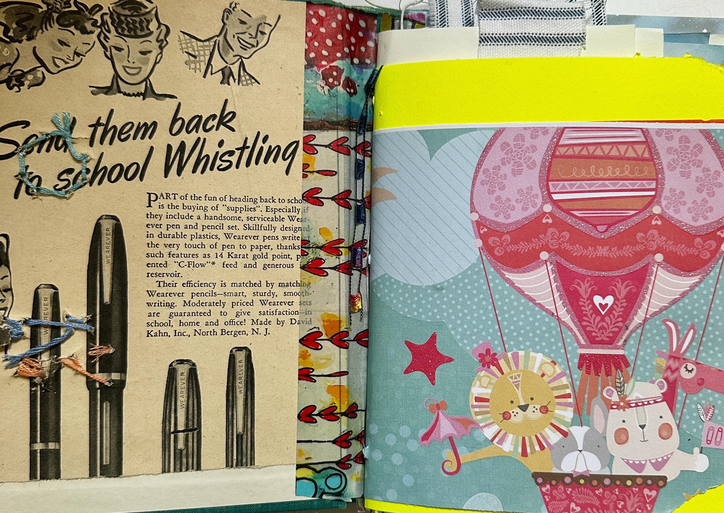 Vintage book turned handmade journal inspired by pure whimsy. Perfect for kids or for the kids at heart. Full of color and so many delightful papers complete with an art starter pack of glue stick, crayons, and stickers. There are envelopes and tuck spots for journaling and art. No two are alike. Vintage and modern ephemera combine to give you the perfect place to create and dream.